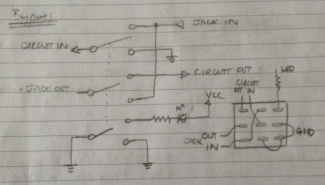 I've included a "true bypass" stomp switch. There are loads of references out there for how to wire up the 3-pole, double-throw (3PDT) switch to support this, including an LED to show when the effect is active. I can't remember exactly which site I used in the end, but the variant I wanted to end up with is as follows: