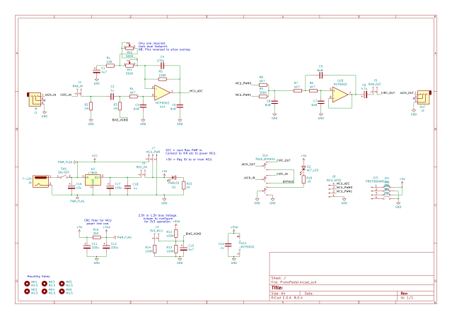 The input and output stages are largely taken from the Electro-smash discussion of their own designs. The MCP6002 is a rail-to-rail opamp and will be running at 5V.